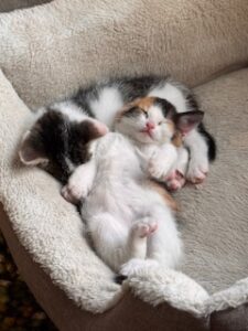 Wij zijn Mia (lapje) en Sep (grijs/wit) en zijn ongeveer 10 weken jong. We wonen op dit moment bij onze oppasmama, we moesten namelijk nog even wat flesjes drinken voordat wij zelf konden eten.