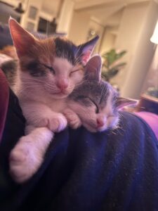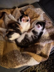 Wij zijn Mia (lapje) en Sep (grijs/wit) en zijn ongeveer 10 weken jong. We wonen op dit moment bij onze oppasmama, we moesten namelijk nog even wat flesjes drinken voordat wij zelf konden eten.