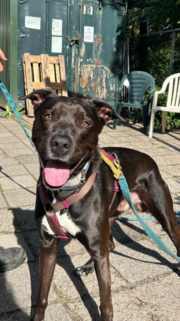 Met de mensen die hij inmiddels goed kent, is het dikke mik: hij komt knuffels halen, ontspant zichtbaar, begint te genieten en zit graag op schoot. Nieuwe mensen of onbekende situaties vindt hij nog best spannend, maar hij doet echt zijn best om het goed te doen. We zien hem elke dag groeien.